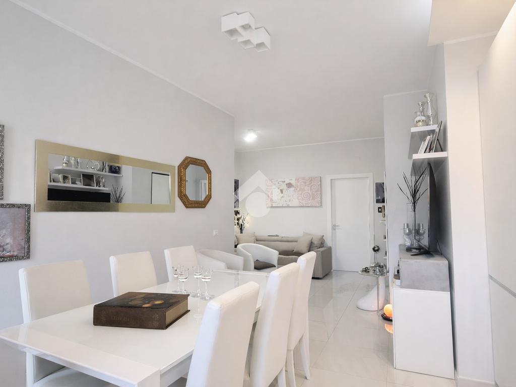 L’ingresso conduce a un luminoso soggiorno con cucina in open space, impreziosito da una moderna illuminazione con faretti a LED nella zona cucina, che conferisce all’ambiente uno stile contemporaneo e accogliente. Gli spazi sono ben distribuiti e ideali sia per la vita quotidiana sia per momenti di convivialità.