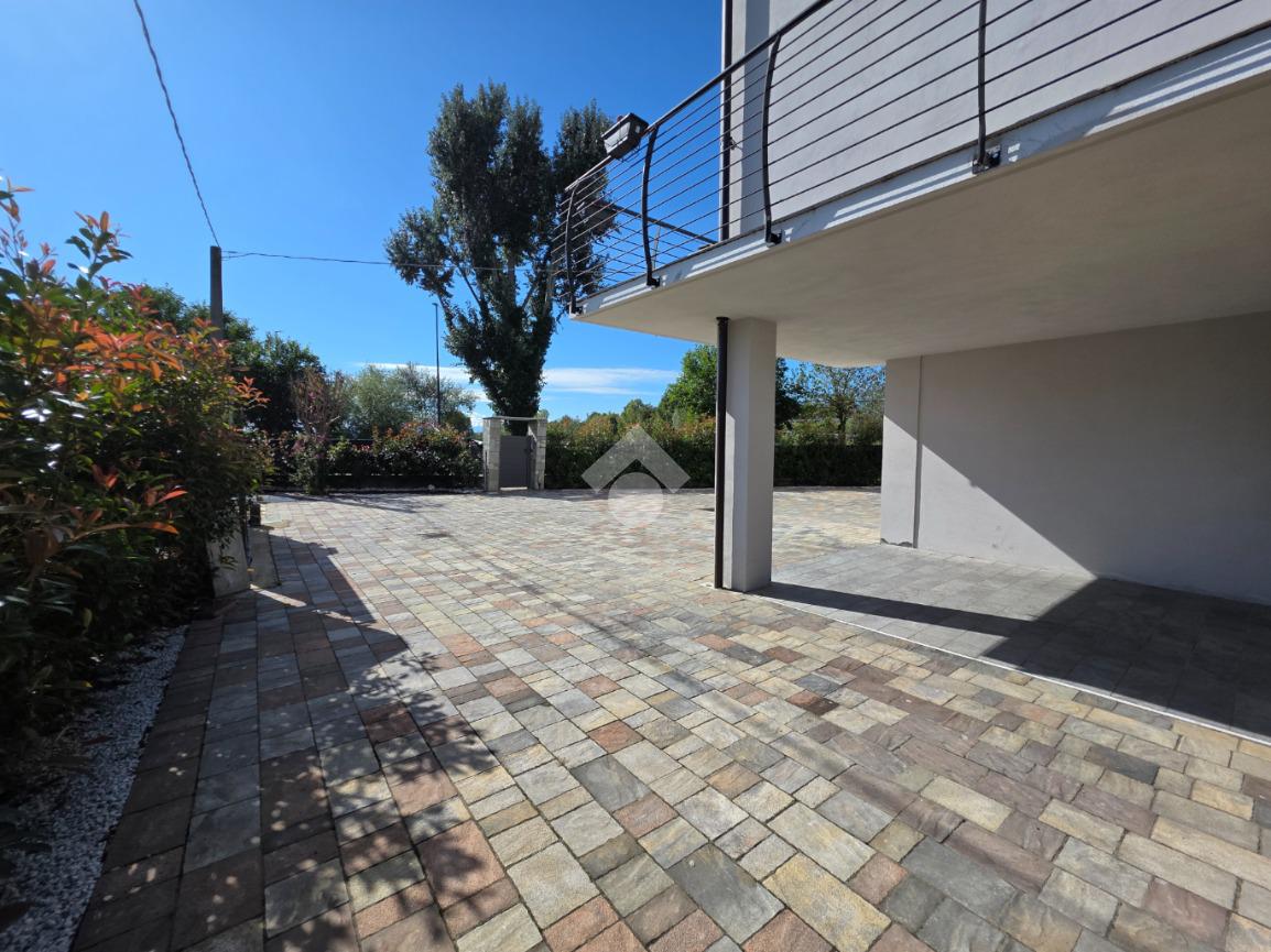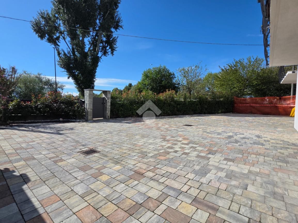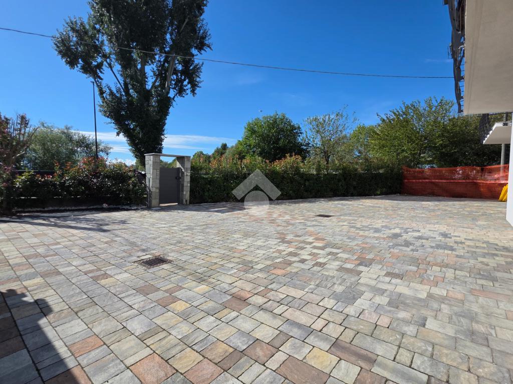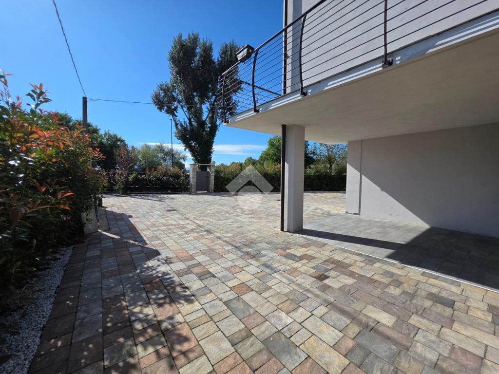 Pavimentazione in laminato effetto legno chiaro, che dona calore e luminosità agli ambienti. All’esterno, vialetti e aree calpestabili sono rifiniti con autobloccanti di qualità, per un risultato estetico curato e duraturo.