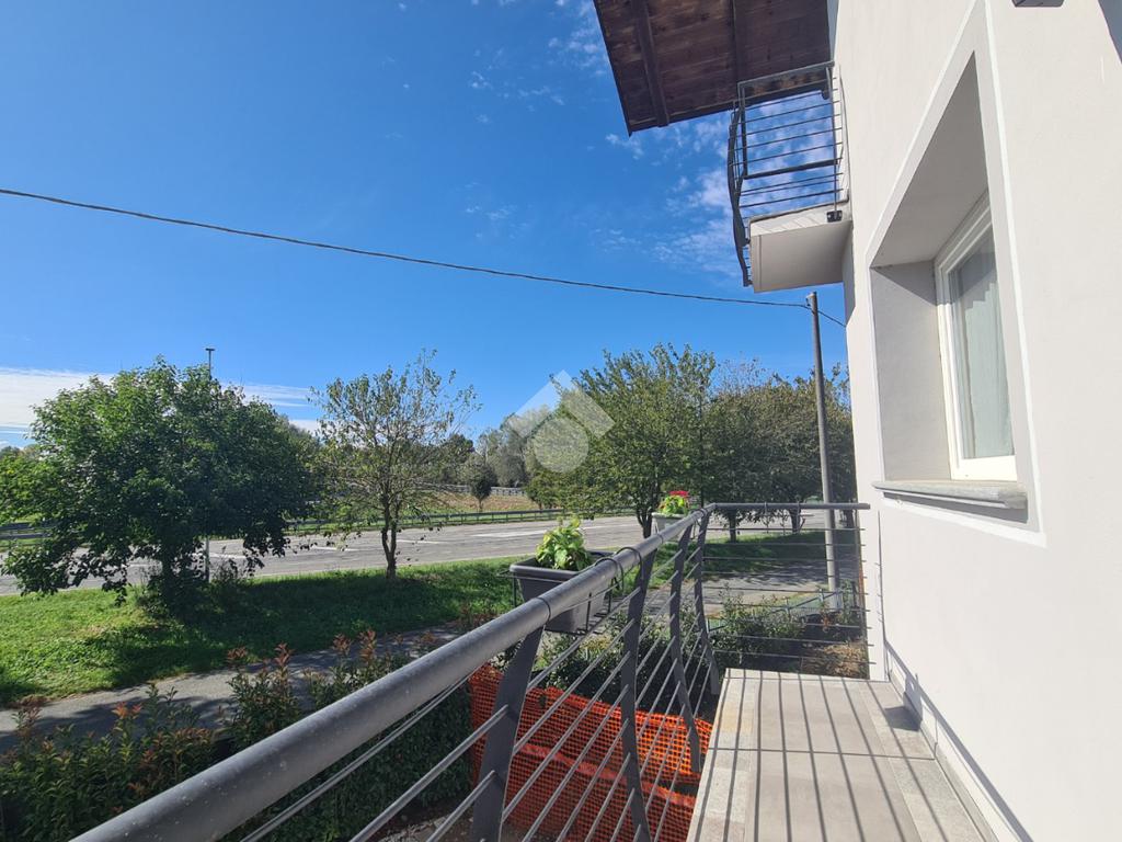 Una balconata esterna in legno aggiunge un tocco di charme rustico e naturale alla casa.